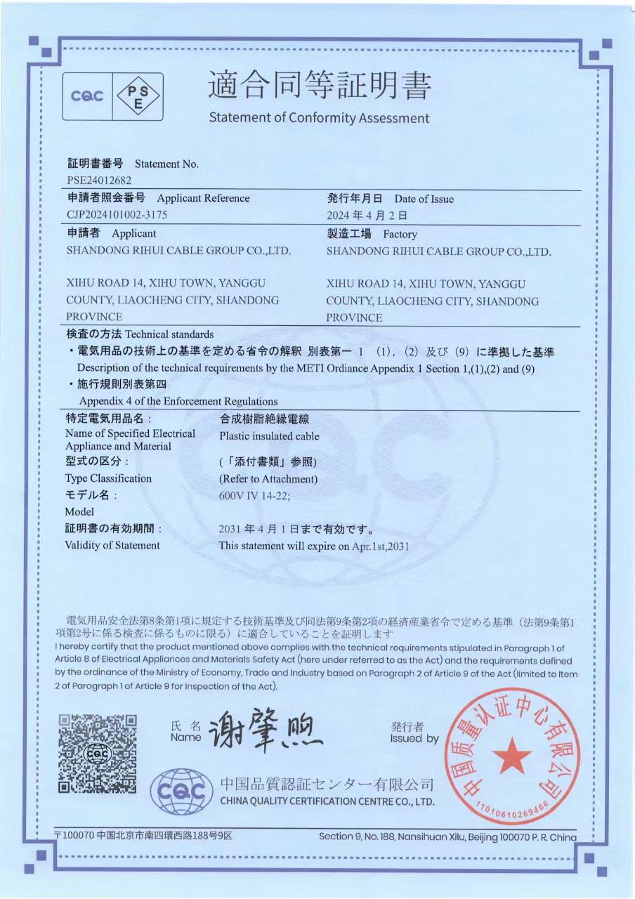 根據(jù)日本的DENTORL規(guī)定,498種產(chǎn)品進(jìn)入日本市場(chǎng)必須通過(guò)安全認(rèn)證。其中,165種A類產(chǎn)品應(yīng)取得菱形的PSE標(biāo)志,333種B類產(chǎn)品應(yīng)取得圓形PSE標(biāo)志。日輝電纜能夠榮獲這一認(rèn)證,進(jìn)一步證明了我們產(chǎn)品的優(yōu)質(zhì)和安全性,為客戶提供了更可靠的保障。